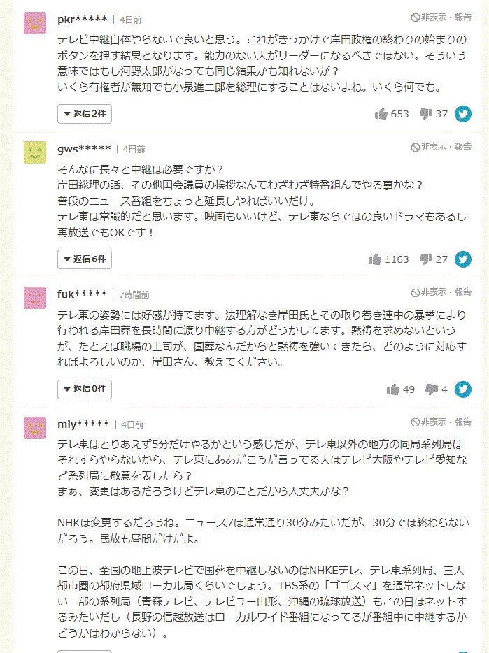 これまでも地上波他局が横並びで中継するイベントでも独自路線を貫いてきたテレビ東京。ツイッター上では「テレ東は国葬を1分たりとも放送しないと思っていたのに5分も放送するのか! ショックだ」との声もあったが、「流石我らのテレ東、皆んなして同じの流す意味がわからない」「テレ東午後ローの視聴率が爆上がりチャンス」「これ、テレ東が最高視聴率かっさらっていくやつだ」などの声があふれているとのこと。そのほかのネット上でのコメントはこちら→
