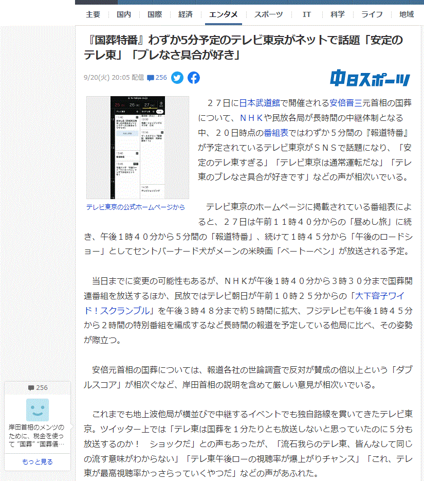 ところで、中日スポーツ紙によると下記のように、『国葬特番』わずか5分予定のテレビ東京がネットで話題「安定のテレ東」「ブレなさ具合が好き」との見出しで、テレビ東京の報道姿勢がまたも、ネット上で話題となっているようです。