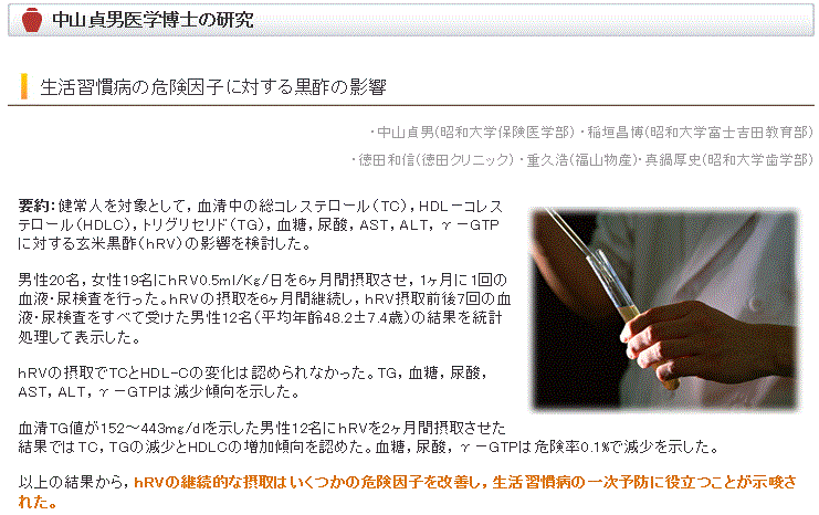 玄米黒酢の効能については、成人病の元凶となる 血糖値、尿酸値、コレステロールの低下をもたらすという。詳細は下の 「中山貞夫医学博士の研究 生活習慣病の危険因子に対する黒酢の影響」をクリックすると詳しい研究結果がご覧になれます。