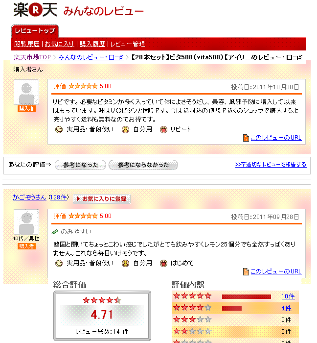 楽天の購入者レポートを見ると「外出前とか忙しい時に飲んでおくと疲れが少なくて済み、体調も早く戻ります。」「このドリンク、かなりいいよ。