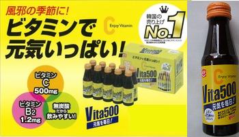 名前は ビタ500といって、ドリンク1本にビタミンCが500mgも含まれているところがこのドリンクのウリです。この 500mg という含有量について述べますと、