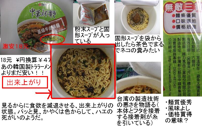 しかし、今は円高なので、1台湾$=2.65円で計算したが、以前のように3円程度になると¥54となり、韓国製トラヌードルといい勝負になる。