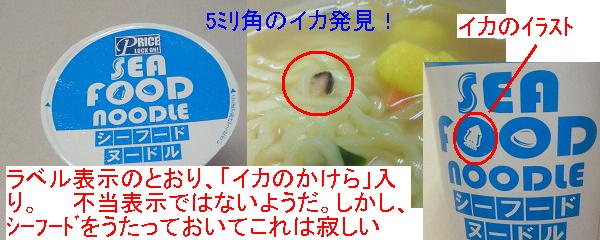 上のC「トライアル シーフードヌードル」の5ミリのイカと比較すると、全く対照的に10倍以上もある。(面積比では、10×10