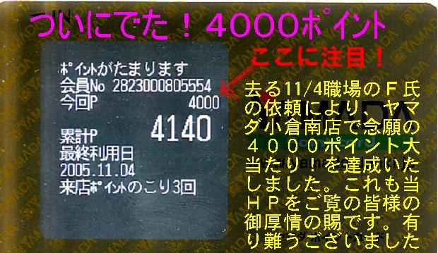 ★ みなさまにおしらせ ★ 2005年11月4日 ついにヤマダ電機のポイントマシンで最高額の 4000ポイント(4000円)がでました! なお、このカードはもともとF氏の所有のため、残念ですがF氏に返却しました。 年賀状シーズンがちかづいていたので、F氏はこのポイント4000円と手出ししてプリンタを 購入したということである。 ★ホームページへもどる★